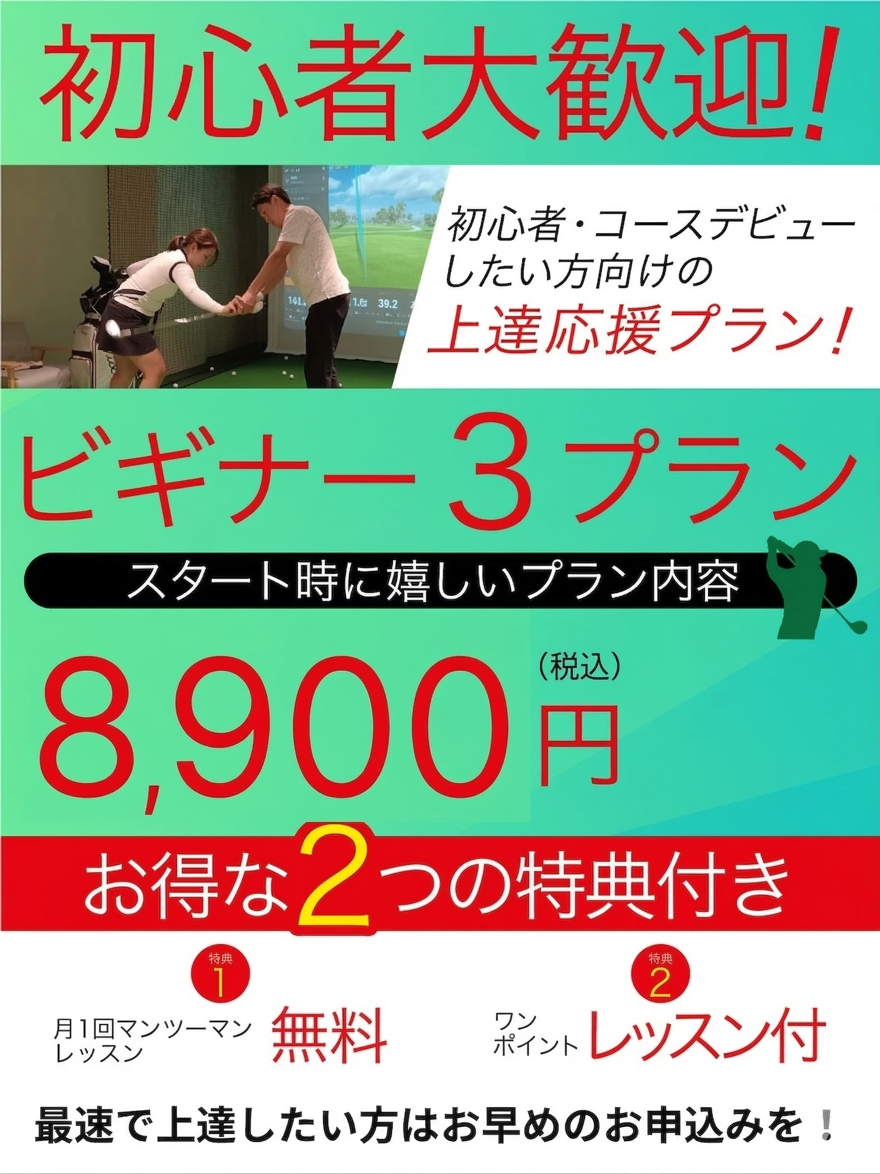 プロスタッフアワーにて、当施設契約プロによるワンポイントレッスンを追加料金なしで気軽に受けられます。初心者の方、さらに上達を目指す方もしっかりとサポートいたします。