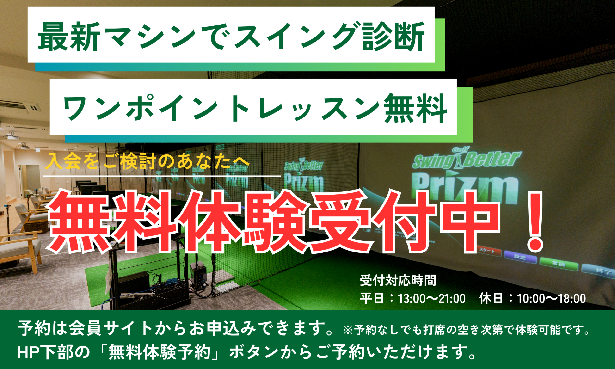 プロスタッフアワーにて、当施設契約プロによるワンポイントレッスンを追加料金なしで気軽に受けられます。初心者の方、さらに上達を目指す方もしっかりとサポートいたします。